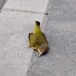 Throughout fall and spring migrations, collision surveys are conducted daily along set routes in downtown Kitchener to assess dangers to migratory birds. During these early morning surveys, volunteers document and collect bird-building collision fatalities and rescue stunned and injured birds.